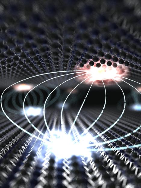 Artistic representation of an interlayer exciton in a layered structure of monolayer transition metal dichalcogenides. The electron (blue) and the hole (red) interact across the atomic distance.