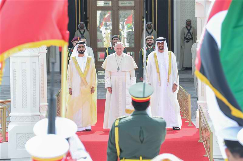 Upon his arrival at the Presidential Palace, Pope Francis, accompanied by cavalry on Arabian horses, was accorded an official reception. A 21-gun salute was fired in honour of the Pontiff, following which the Papal Anthem and that of the United Arab Emirates were played.